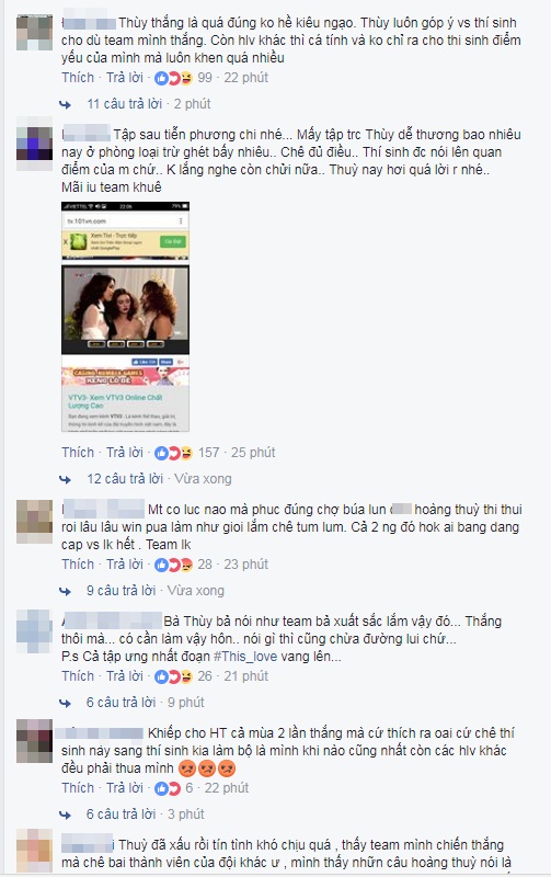 Tuy nhiên, màn loại trừ của Hoàng Thùy khi lên sóng đã nhận nhiều ý kiến trái chiều từ cư dân mạng. Có lẽ vì đã quen với hình ảnh chân quê, hài hước của Hoàng Thùy nên khá nhiều người xem chưa quen với phong thái HLV của cô ở The Face. Trước cơn bão chỉ trích nhắm tới mình, Hoàng Thùy chỉ hài hước đáp lại: “Lần sau mà thắng, loại chỉ nói một câu tục ngữ cho trăm họ hài lòng”.