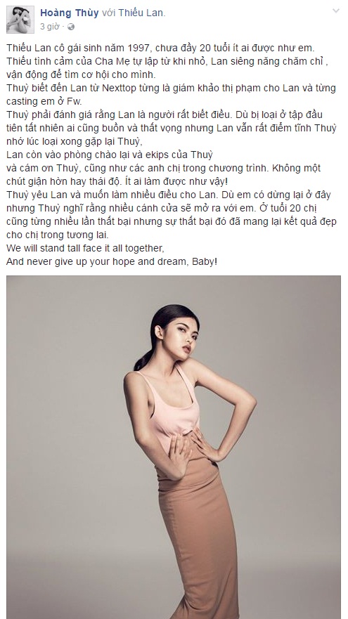 Tuy nhiên, mới đây Hoàng Thùy đã lên tiếng bênh vực cho cô học trò nhỏ, gián tiếp phủ nhận những đánh giá của Lan Khuê: “Thiếu Lan cô gái sinh năm 1997, chưa đầy 20 tuổi ít ai được như em. (…). Thuỳ phải đánh giá rằng Lan là người rất biết điều. Dù bị loại ở tập đầu tiên tất nhiên ai cũng buồn và thất vọng nhưng Lan vẫn rất điểm tĩnh Thuỳ nhớ lúc loại xong gặp lại Thuỳ, Lan còn vào phòng chào lại và ekips của Thuỳ và cám ơn Thuỳ, cũng như các anh chị trong chương trình. Không một chút giận hờn hay thái độ. Ít ai làm được như vậy!”.