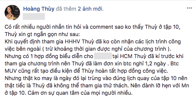 “Ban tổ chức Miss Universe Vietnam cũng rất tạo điều kiện để Thuỳ hoàn tất hợp đồng công việc. Nhưng không may là ngày đó lại trùng vào đúng lịch quay của tập 10 nên thật tiếc là Thuỳ đã không thể tham gia thử thách, đành lỡ hẹn với mọi người ở tập 10. Cảm ơn sự quan tâm của mọi người nhiều” - Hoàng Thuỳ chia sẻ.