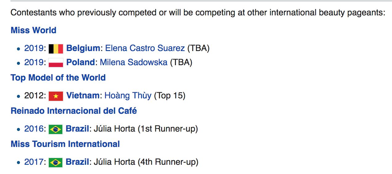 Nhóm thí sinh này được xác định cho đến thời điểm hiện tại bao gồm: Đại diện Bỉ - Elena Castro Suarez (TBA), Ba Lan - Milena Sadowska (TBA) sẽ cùng tham gia Miss World 2019; Top 15 cuộc thi Top Model of the World 2012 - Hoàng Thùy, Việt Nam và Júlia Horta đến từ Brazil với thành tích Reinado Internacional del Café 2016 (1st Runner-up), Miss Tourism International 2017 (4th Runner-up).