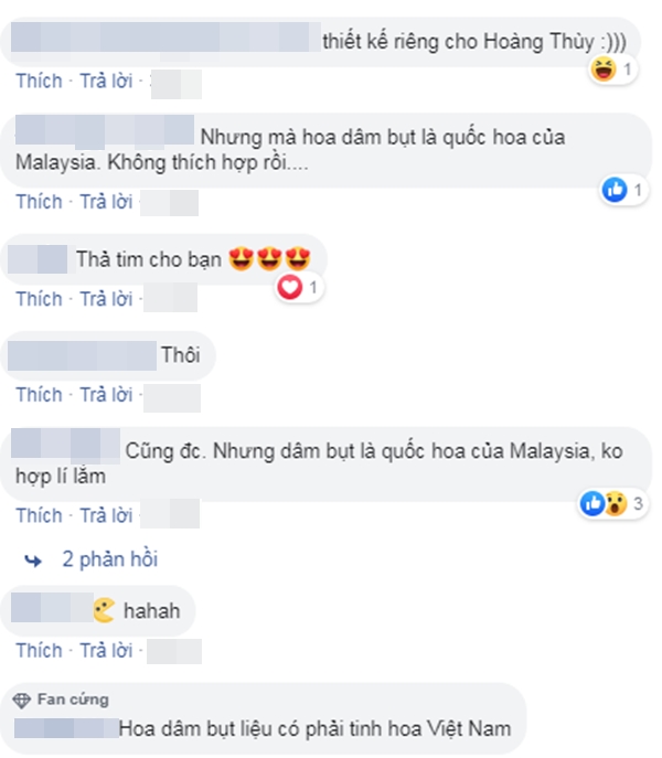 Tuy vậy vẫn có ý kiến cho rằng dâm bụt là quốc hoa của Malaysia nên “Đỏ thơm” khó có thể mang đến nét đẹp độc đáo và sự nổi bật cho Hoàng Thùy. Một thiết kế khác được chú ý không kém kết hợp giữa hoa dâm bụt và… gánh chè liệu có là lựa chọn hoàn hảo.