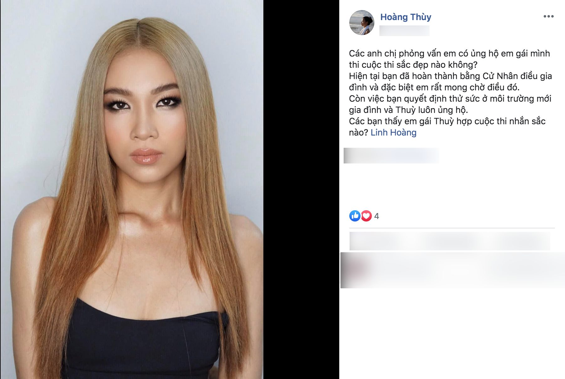 Sau khi chia sẻ về hình ảnh cô em gái xinh đẹp, Hoàng Thùy nhận được rất nhiều những câu hỏi liệu rằng người đẹp có nên đôn đốc Hoàng Linh đăng ký một cuộc thi nhan sắc để nối tiếp thành công của chị gái.