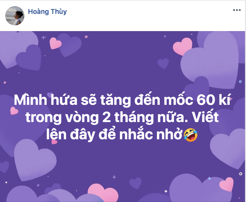 Tuy nhiên, mới đây niềm hy vọng vào Hoàng Thùy càng được khẳng định khi Á hậu quyết tâm tăng cân và nhờ CĐM kiểm chứng trong vòng hai tháng tới. Nguyên văn dòng chia sẻ của Á hậu khiến “dân tình” quyết tâm hứa sẽ kiểm chứng: “Mình hứa sẽ tăng đến mốc 60 kí trong vòng 2 tháng nữa. Viết lên đây để nhắc nhở”.