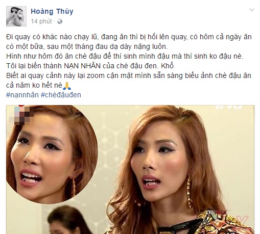 Trong tập 2 The Face vừa lên sóng, HLV Hoàng Thùy đã vô tình có một khoảnh khắc “ngượng chưa kìa” khi bị soi cảnh quên xỉa răng trong buổi phỏng vấn. Trần tình về sự cố này, Hoàng Thùy cho biết do lịch quay bận rộn nên cô phải tranh thủ vừa dùng bữa vừa tham gia ghi hình. Ngoài ra, chân dài xứ Thanh cũng hài hước chia sẻ thêm: “Hình như ôm đó ăn chè đậu để thí sinh mình đậu mà thí sinh không đậu. Tôi lại biến thành NẠN NHÂN của chè đậu đen. Khổ”.