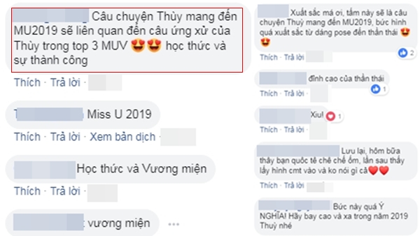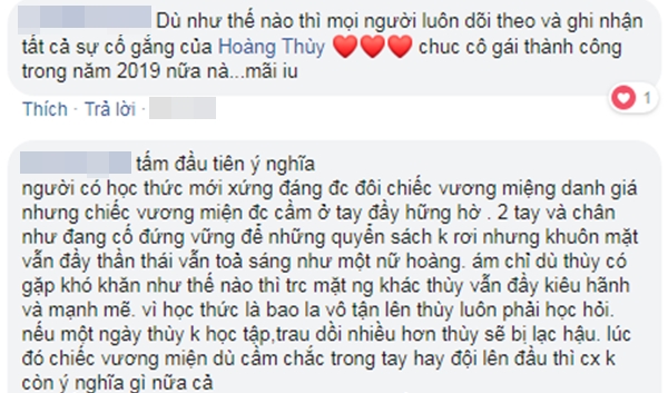 Là ứng viên sáng giá có thể đại diện Việt Nam tham gia đấu trường nhan sắc Hoa hậu Hoàn vũ - Miss Universe 2019, các fan cho rằng Hoàng Thùy nên mang chính thông điệp ý nghĩa về học thức và sự thành công này vào cả phần thi Interview lẫn ứng xử. Chắc chắn, nếu có cơ hội phát biểu từ chính câu chuyện của bản thân mình, cô nàng sẽ để lại dấu ấn đặc biệt về hình ảnh “tay cầm vương miện - sách đội đầu” này.