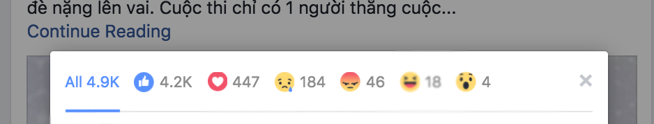 Sau khoảng 4 tiếng, chia sẻ của Hoàng Thuỳ thu về hơn 5 nghìn lượt phản ứng của cư dân mạng, trong đó tỉ lệ “giận dữ” chiếm khoảng 1% so với các phản ứng còn lại.