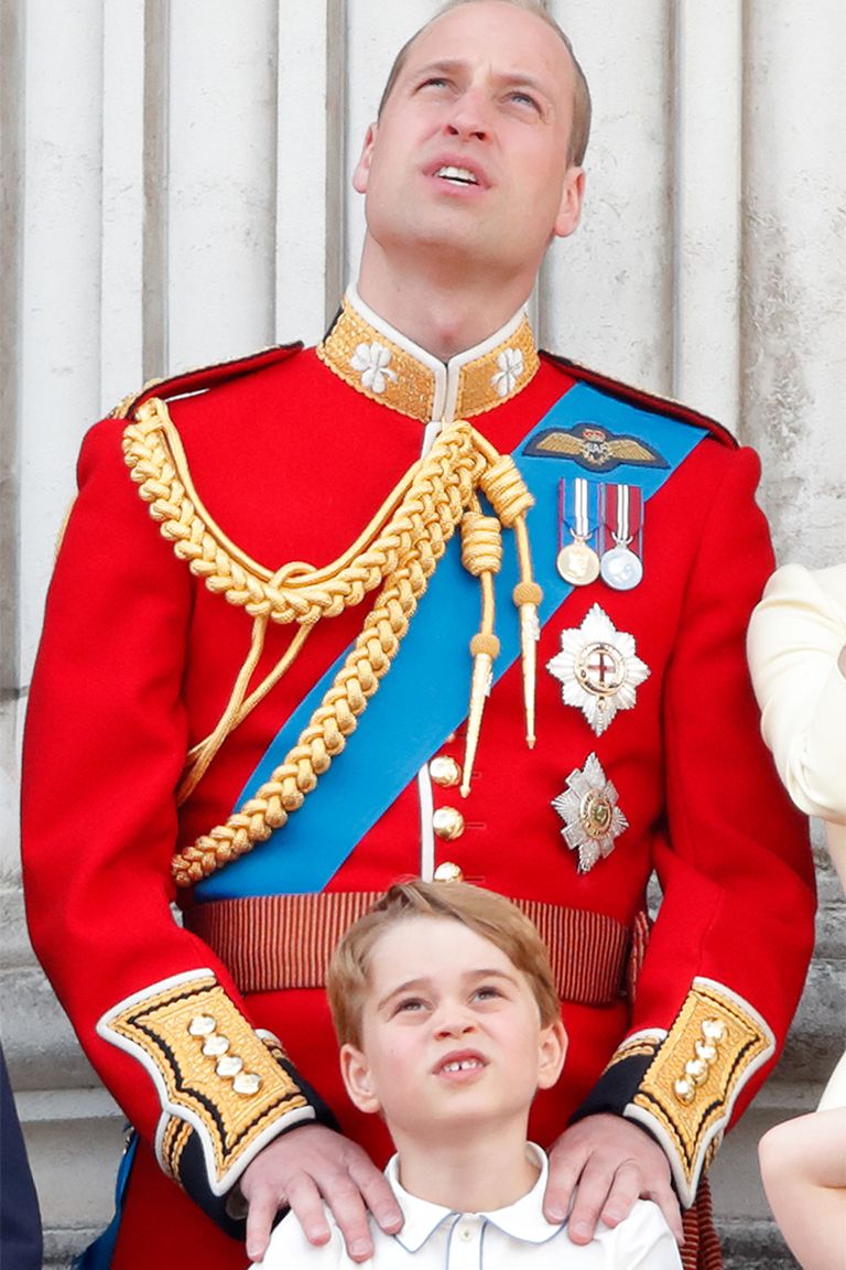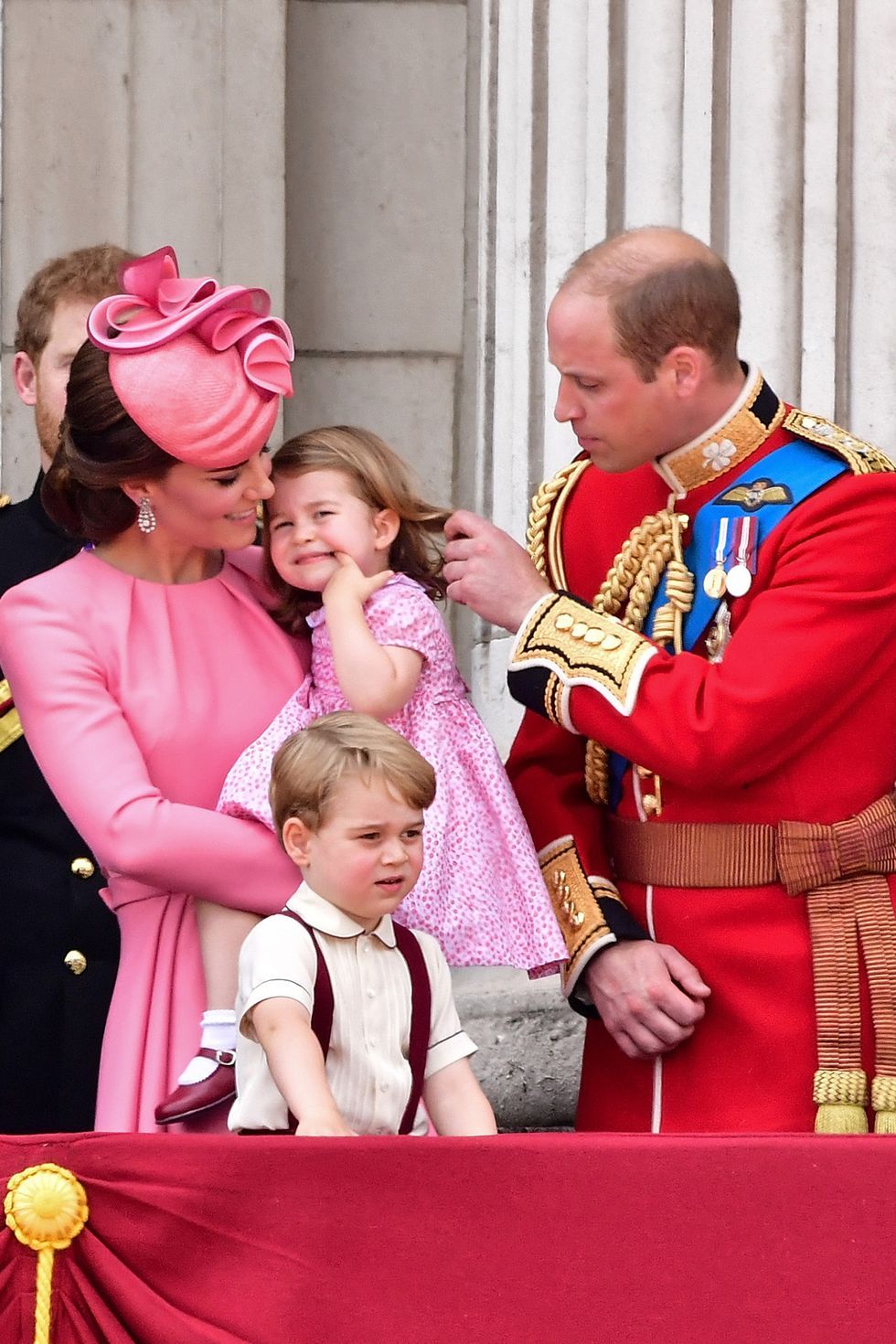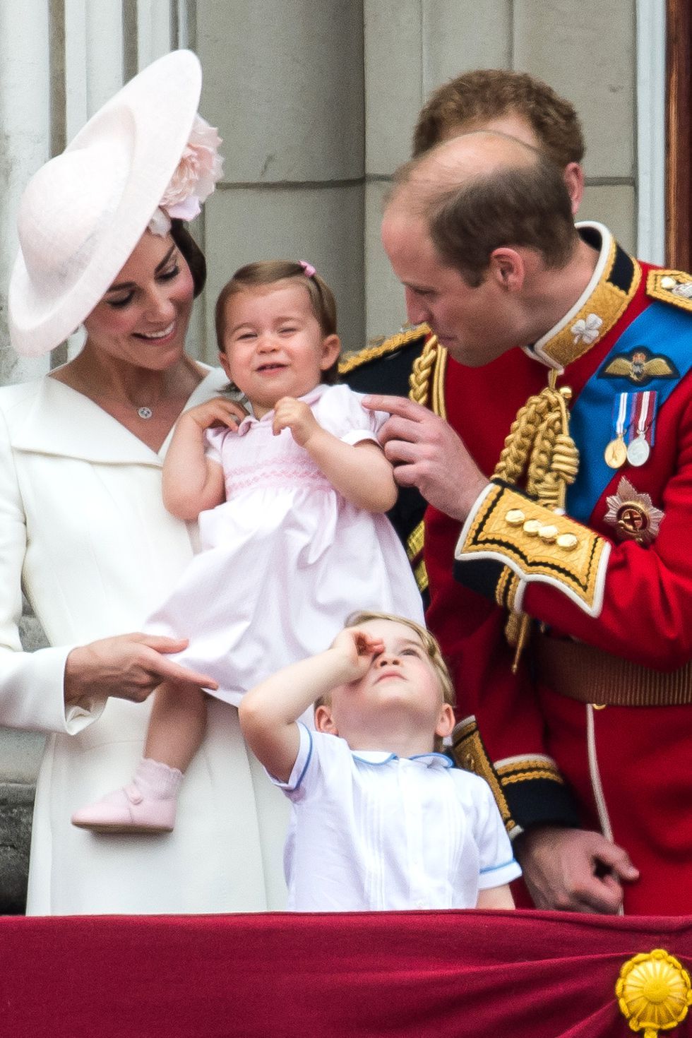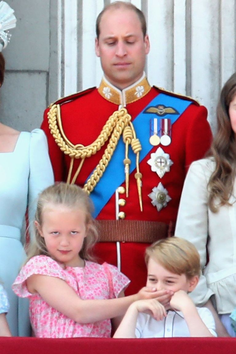 22. Hoàng tử William theo dõi khi Savannah Philips và Hoàng tử George chơi đùa trên ban công Buckingham Palaces trong Trooping the Color 2018.