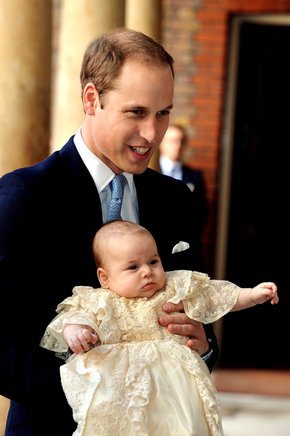 2. Hoàng tử bé George ‘ngơ ngác’ trong vòng tay bố tại Nhà thờ Hoàng gia, Cung điện St James để làm lễ rửa tội ba tháng tuổi vào ngày 23 tháng 10 tại London.
