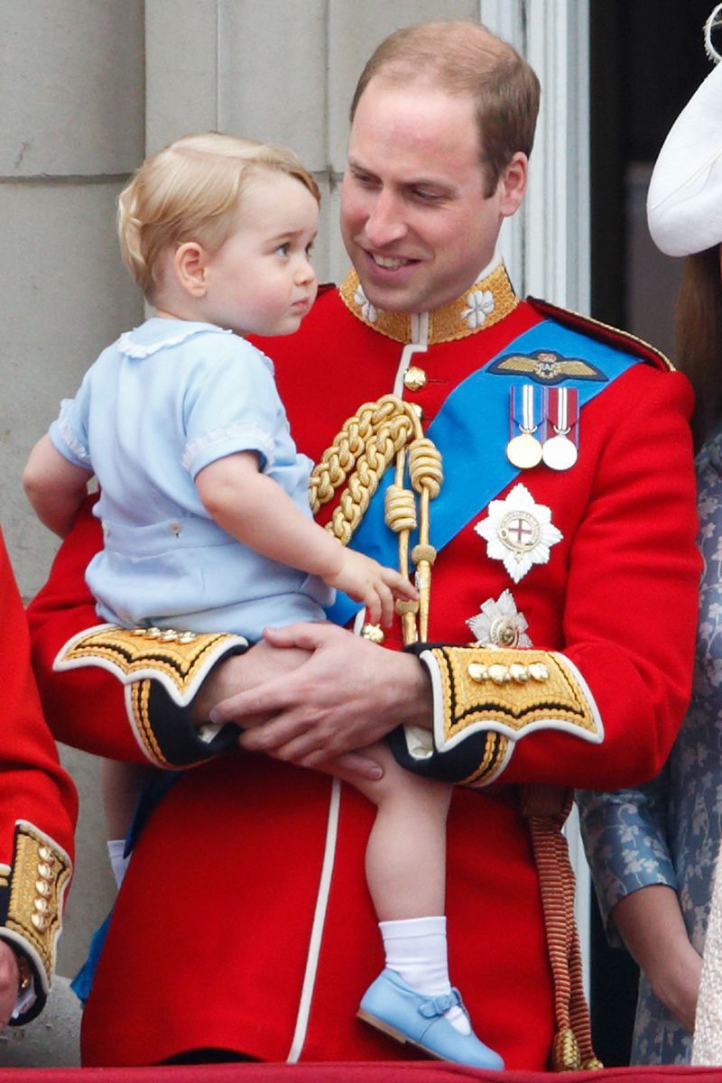 9. Bố William bế George trên ban công Cung điện Buckingham tại buổi lễ Trooping the Color vào ngày 13 tháng 6 năm 2015.