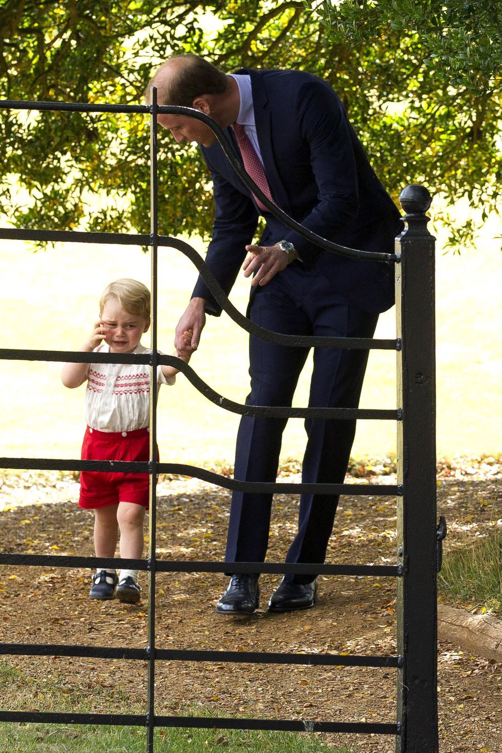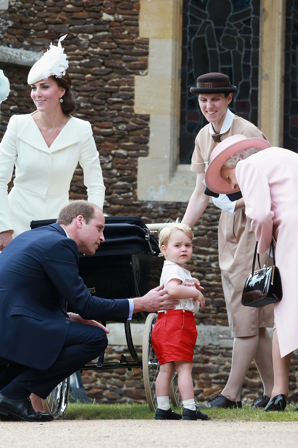 10. Hoàng tử William hướng dẫn Hoàng tử George nói lời chào với Nữ hoàng Elizabeth II. Cả gia đình hoàng gia đều có mặt tại nhà thờ St Mary Magdalene sau lễ rửa tội của công chúa Charlotte vào ngày 5 tháng 7 năm 2015.