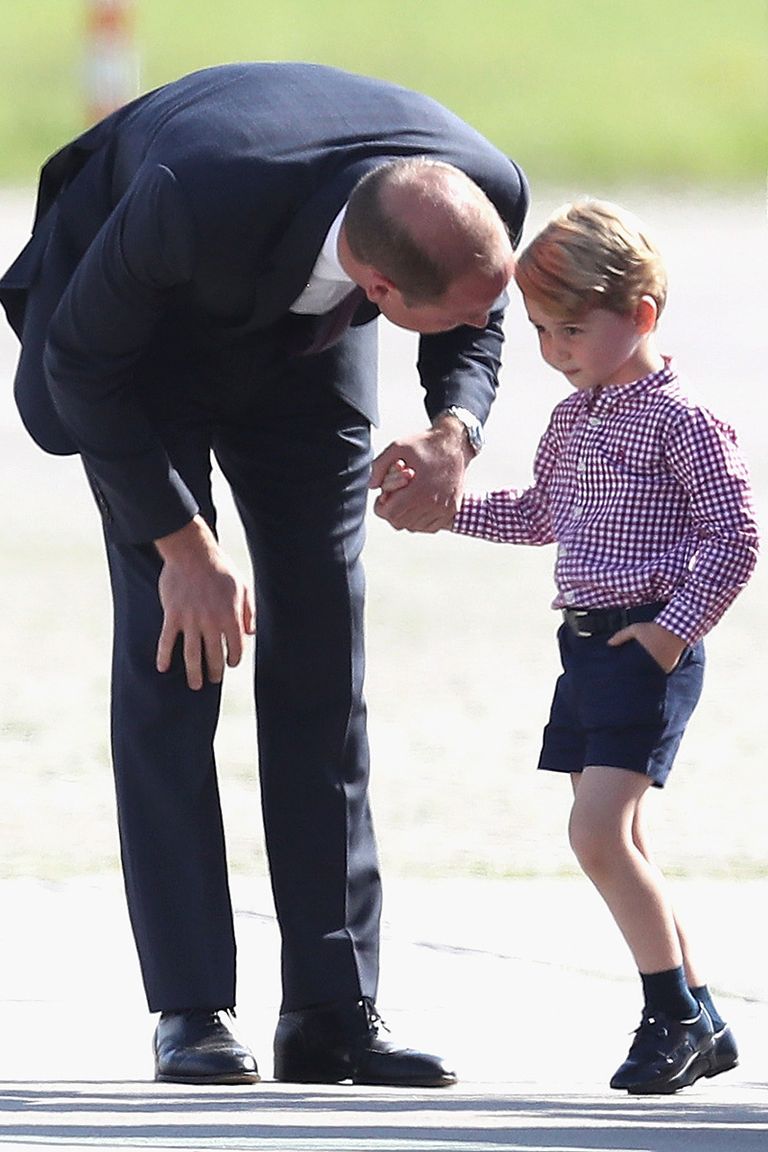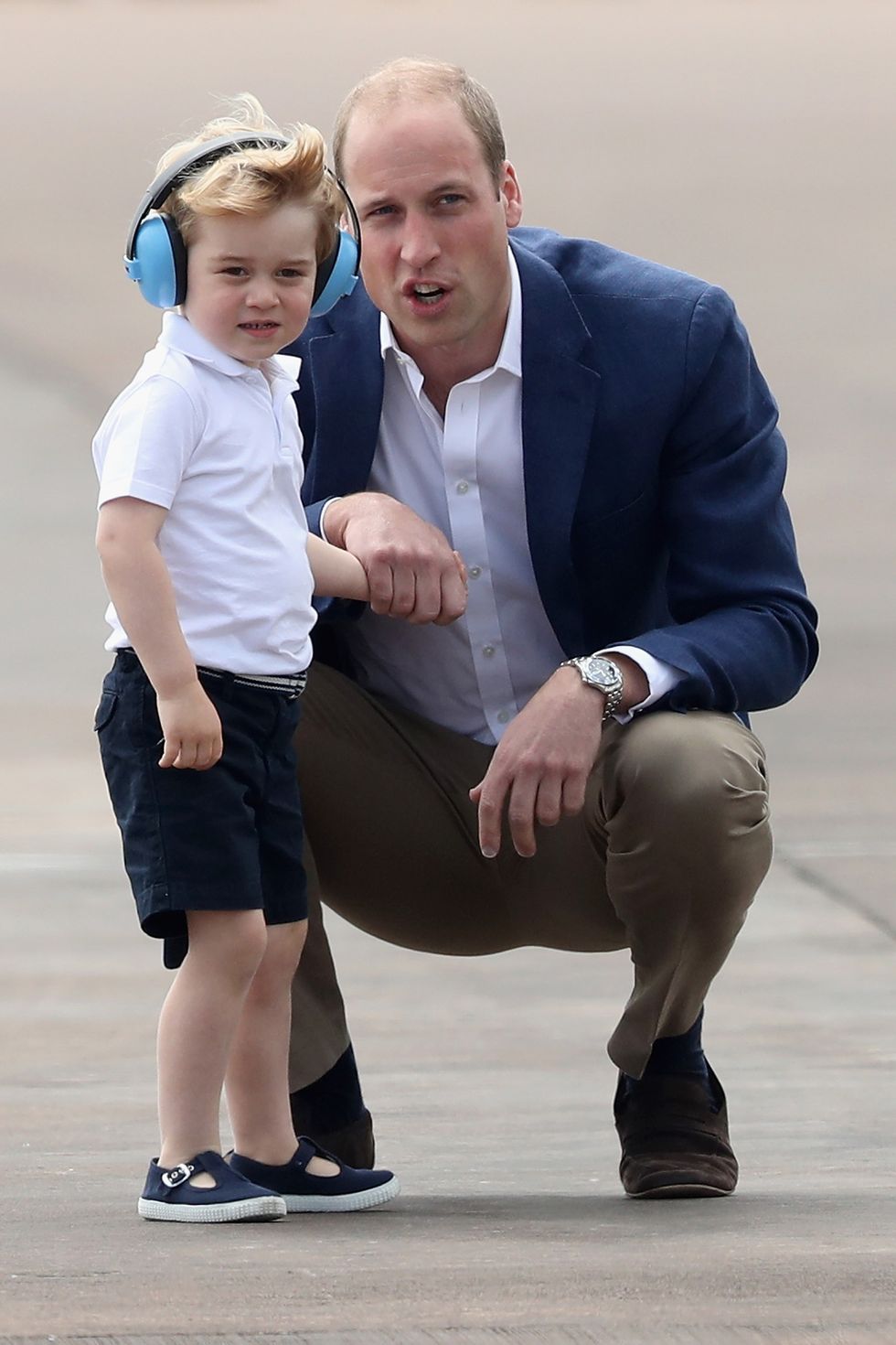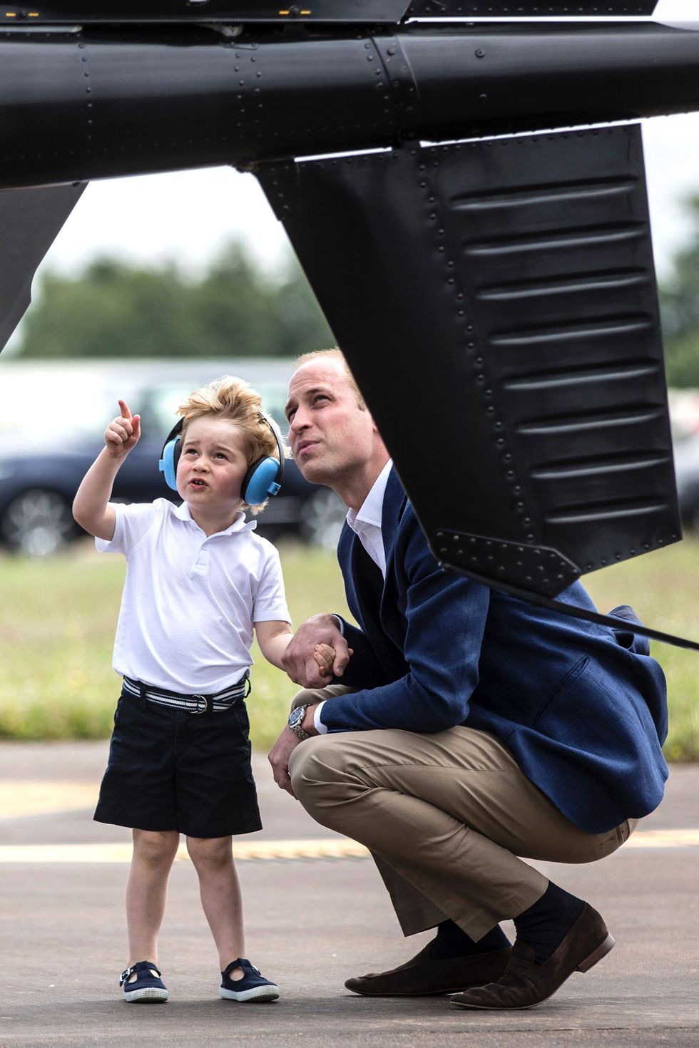 14. Bố William nắm tay và giới thiệu về máy bay cho George trong chuyến viếng thăm Royal International Air Tattoo tại RAF Fairford.