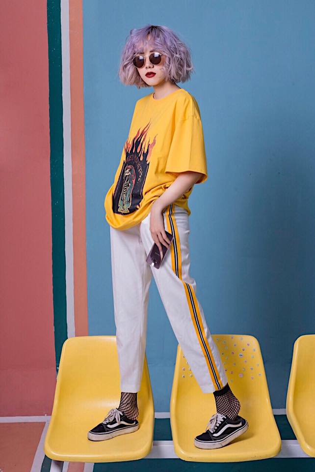 Tương tự như phong cách tương phản, color block (phối đồ với nhiều màu sắc nổi bật khác nhau) là cuộc chơi không hề đơn giản. Chất liệu kính và kim loại có độ bóng cao khiến Galaxy S8+ Tím Khói sở hữu khả năng chuyển đổi tông màu vô cùng thú vị. Có lúc người dùng sẽ thấy sắc tím phủ đều lên thân máy, có khi lại thấy màu khói chiếm ưu thế, thỉnh thoảng lại nhìn ra ánh xanh xám trên thân máy. Tận dụng đặc điểm này, Phương Ly đã “chơi nổi” khi kết hợp hàng loạt màu sắc khác nhau, từ tóc tím khói, áo vàng, quần trắng, kính đen bên cạnh chiếc Galaxy S8+ Tím Khói đặc biệt. Tất cả tạo nên một diện mạo vô cùng thời trang và cá tính.