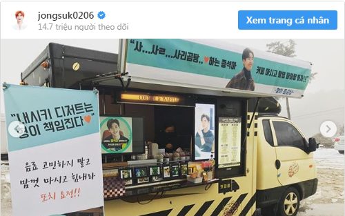 Bên cạnh đó, chiếc xe cafe tương tự gửi đến trường quay bộ phim từ nam diễn viên Yoon Kyun Sang cũng được Lee Jong Suk chia sẻ. Có vẻ như anh chàng nhận được khá nhiều sự ưu ái từ “hội mỹ nam” bạn thân khiến khán giả không khỏi ngưỡng mộ.