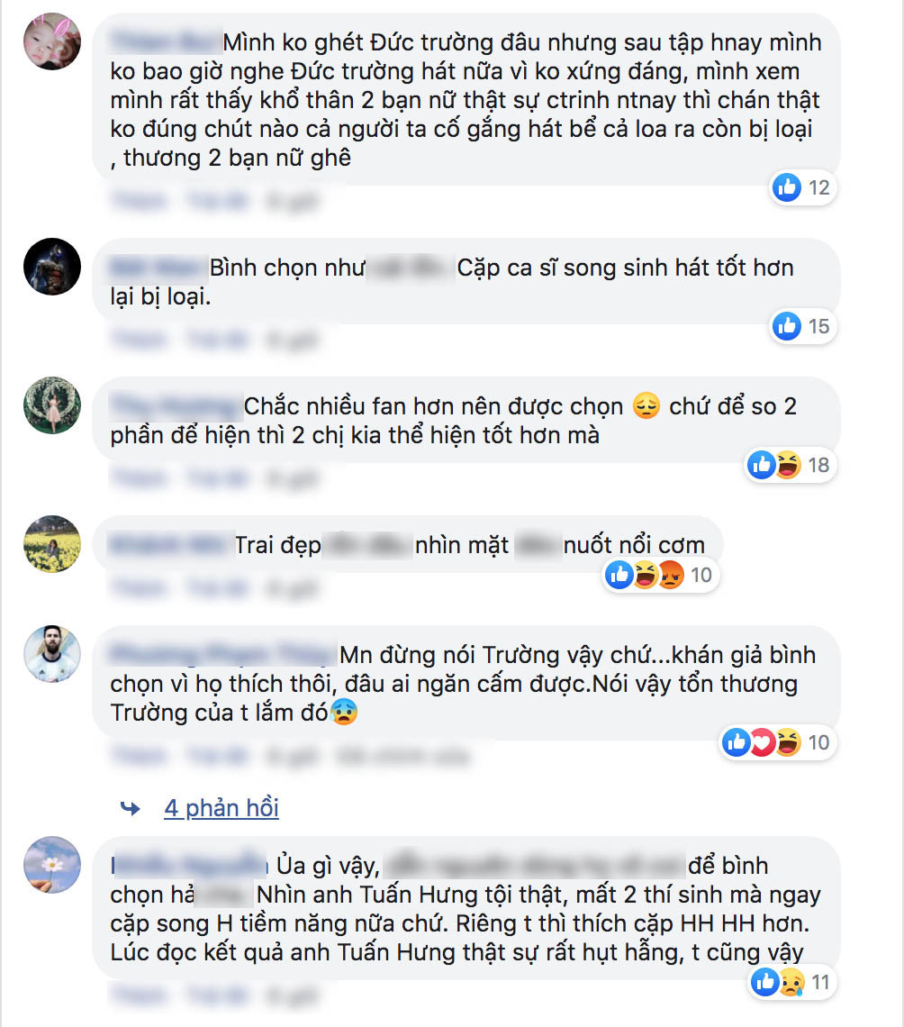 Ở phần thi của Hồng Hòa - Hồng Hiếu team HLV Tuấn Hưng và Đức Trường team HLV Thanh Hà, khán giả đánh giá cao màn song ca của cặp chị em sinh đôi hơn là màn solo của Đức Trường.