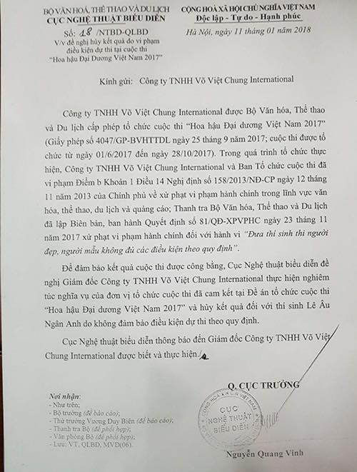 Ngày 11/1, NSND Nguyễn Quang Vinh - quyền Cục trưởng Cục NTBD ký văn bản số 18/NTBD-QLBD gửi BTC cuộc thi Hoa hậu Đại dương 2017. Theo đó, Cục NTBD yêu cầu huỷ kết quả của người đẹp Lê Âu Ngân Anh do không đảm bảo điều kiện dự thi theo quy định.