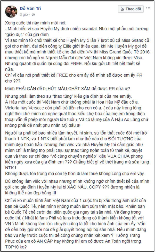 Trong bức tâm thư dài hơn 1.000 chữ, NTK Đỗ Vân Trí “tố” gia đình Huyền My quá tự cao khi cho rằng anh phải thực hiện trang phục miễn phí cho cô để đổi lại việc được quảng bá hình ảnh thông qua tên tuổi của Á hậu.