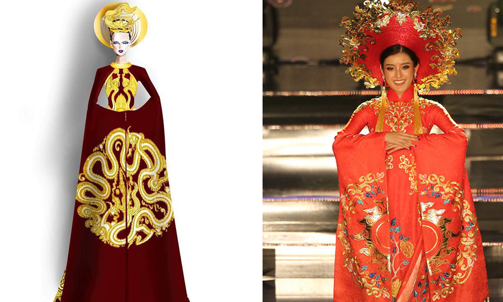 Không khó nhận ra những điểm giống nhau giữa thiết kế của Đỗ Vân Trí và bộ trang phục dân tộc của Huyền My.
