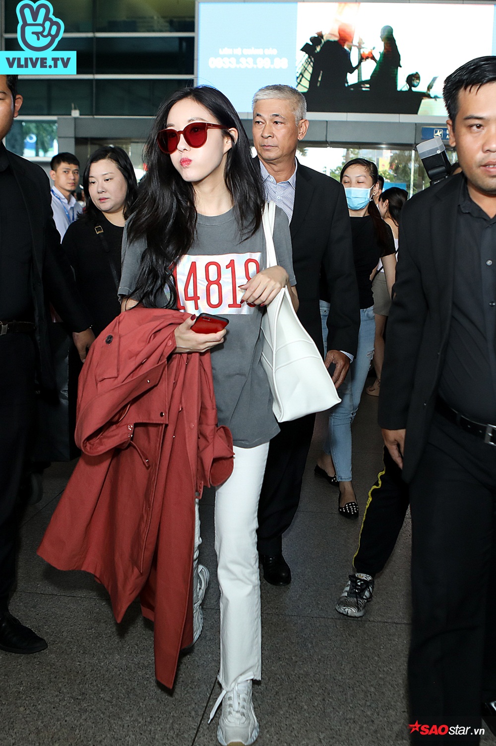Cô nhanh chóng được các vệ sĩ hộ tống ra xe.