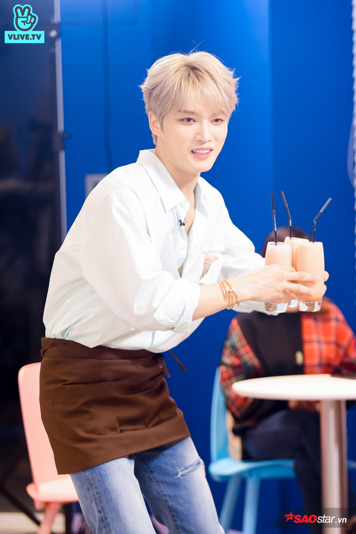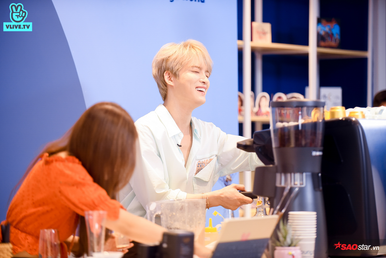 Mất khá lâu để thực hiện đồ uống và liên tục bối rối khi pha chế, Kim Jae Joong liền bào chữa: “Để tất cả đồ uống được ngon mình sẽ cho thật nhiều nguyên liệu để các bạn cảm nhận được tấm lòng của mình. Các bạn đừng nghĩ là mình làm không được nha, thật ra mình cố tình làm vậy để thay đổi không khí đó“. Sau khi hoàn thành đồ uống, anh chàng còn trực tiếp bưng ra phục vụ từng fan một cách ân cần.