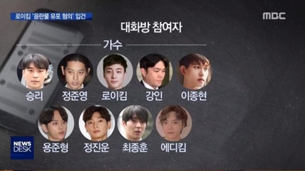 Mới đây, bản tin News Desk của đài MBC đã chính thức công bố danh sách 10 ca sĩ và diễn viên tham gia vào nhóm chat tình dục đang gây chấn động thời gian gần đây. Những cái tên này bao gồm: Jung Joon Young, Seungri, Roy Kim, Kang In (Super Junior), Lee Jong Hyun (CNBlue), Jung Jin Woon (2AM), Yong Jun Hyung (Highlight), Choi Jong Hoon (F.T.Island), Eddy Kim và người mẫu Lee Chul Woo.