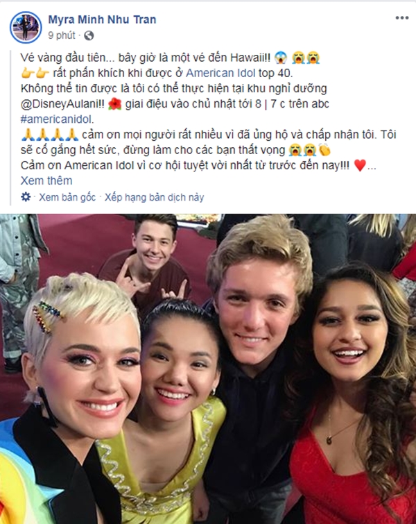 Myra Trần bật khóc nức nở vì đã vượt qua rất nhiều giọng ca tài năng nước Mỹ. Trên trang cá nhân, cô nàng ngay lập tức chia sẻ cảm xúc khi là thí sinh Việt Nam đầu tiên góp mặt trong Top 40 American Idol: “Cảm ơn mọi người rất nhiều vì đã ủng hộ tôi, chấp nhận tôi. Tôi sẽ cố gắng hết sức để không làm cho các bạn thất vọng. Cảm ơn American Idol vì cơ hội tuyệt vời nhất từ trước đến nay”.