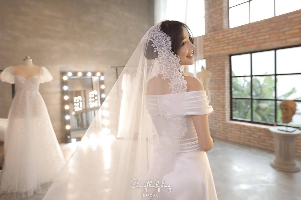 Bộ váy cưới của Nhã Phương chọn chất liệu satin cao cấp được nhập khẩu hoàn toàn từ Pháp và Italy để sáng tạo nên mẫu váy của Nhã Phương. Khăn voan đi kèm bộ váy này đính ren ở đường diềm. Váy satin dáng xòe nhẹ theo phong cách tối giản có ưu điểm tôn dáng.