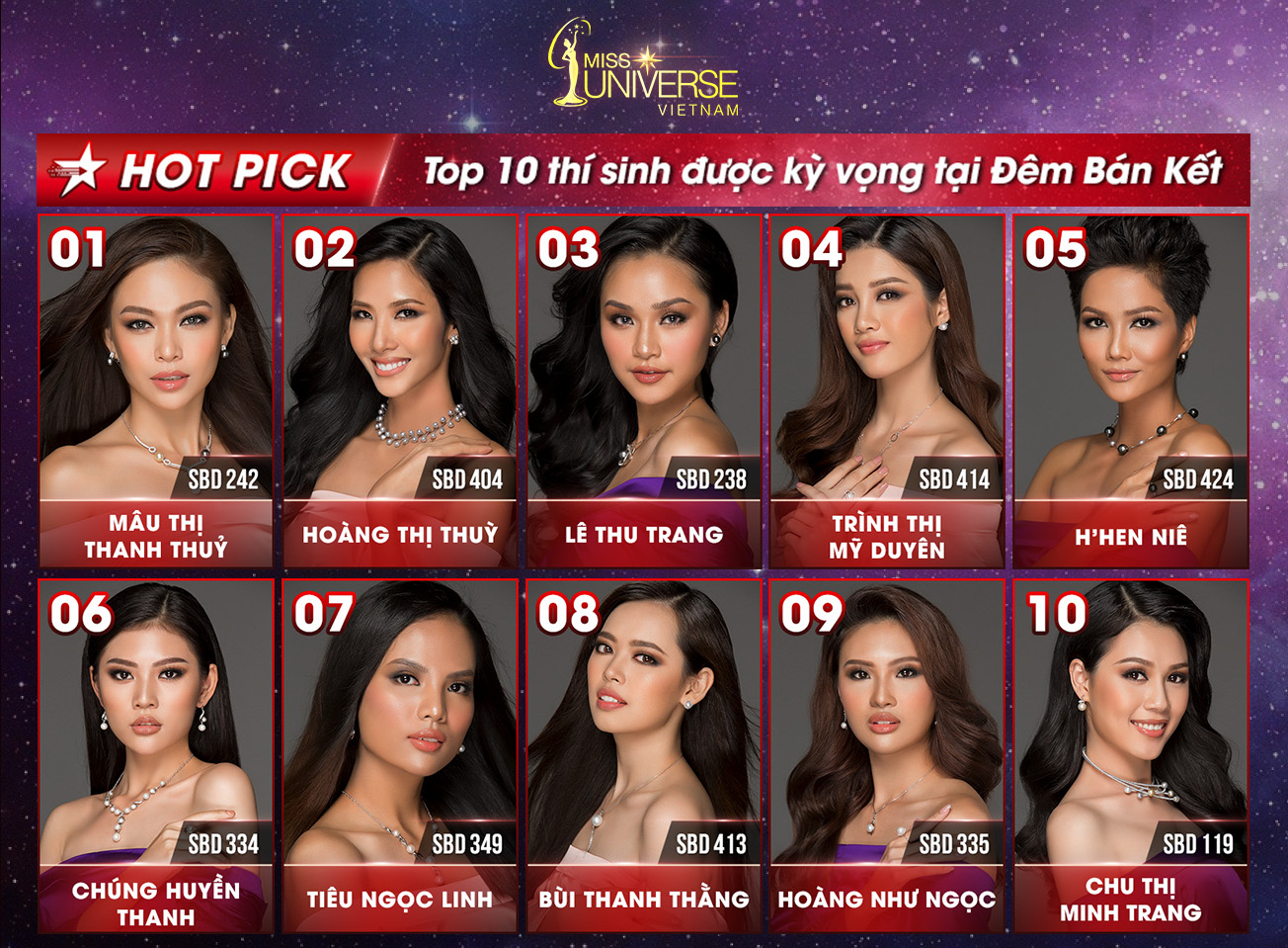 Dựa trên các hoạt động bên lề từ các tập đã được phát sóng của Tôi là Hoa hậu Hoàn vũ Việt Nam 2017, cùng với các ý kiến từ những chuyên gia, dưới đây là 10 gương mặt đang dành được sự kỳ vọng đặc biệt sẽ vượt qua vòng Bán kết tối nay và có mặt tại đêm chung kết sắp tới.