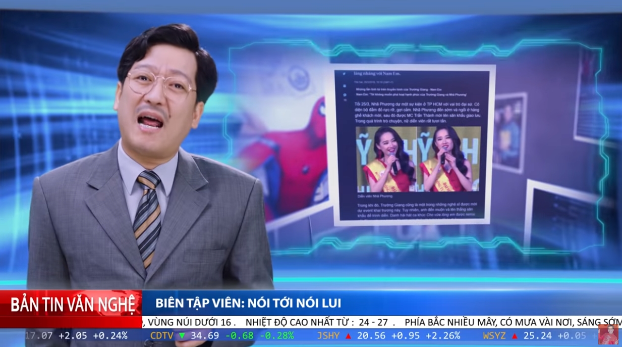 Xuất hiện trong đoạn clip, Trường Giang vào vai người dẫn chương trình duyên dáng đưa tin về việc sẽ cho phóng viên (Nhã Phương) đến tận nhà để hỏi rõ những thắc mắc bấy lâu của khán giả. Bà xã “Mười Khó” khiến cư dân mạng “cười ngất” khi liên tục “hỏi xoáy” ông chồng: “Anh vừa lùn vừa xấu vậy bí quyết gì để anh có thể chinh phục trái tim của một nữ diễn viên xinh đẹp?“. Đáp lại, Trường Giang cũng “chặt chém” vợ không thương tiếc.