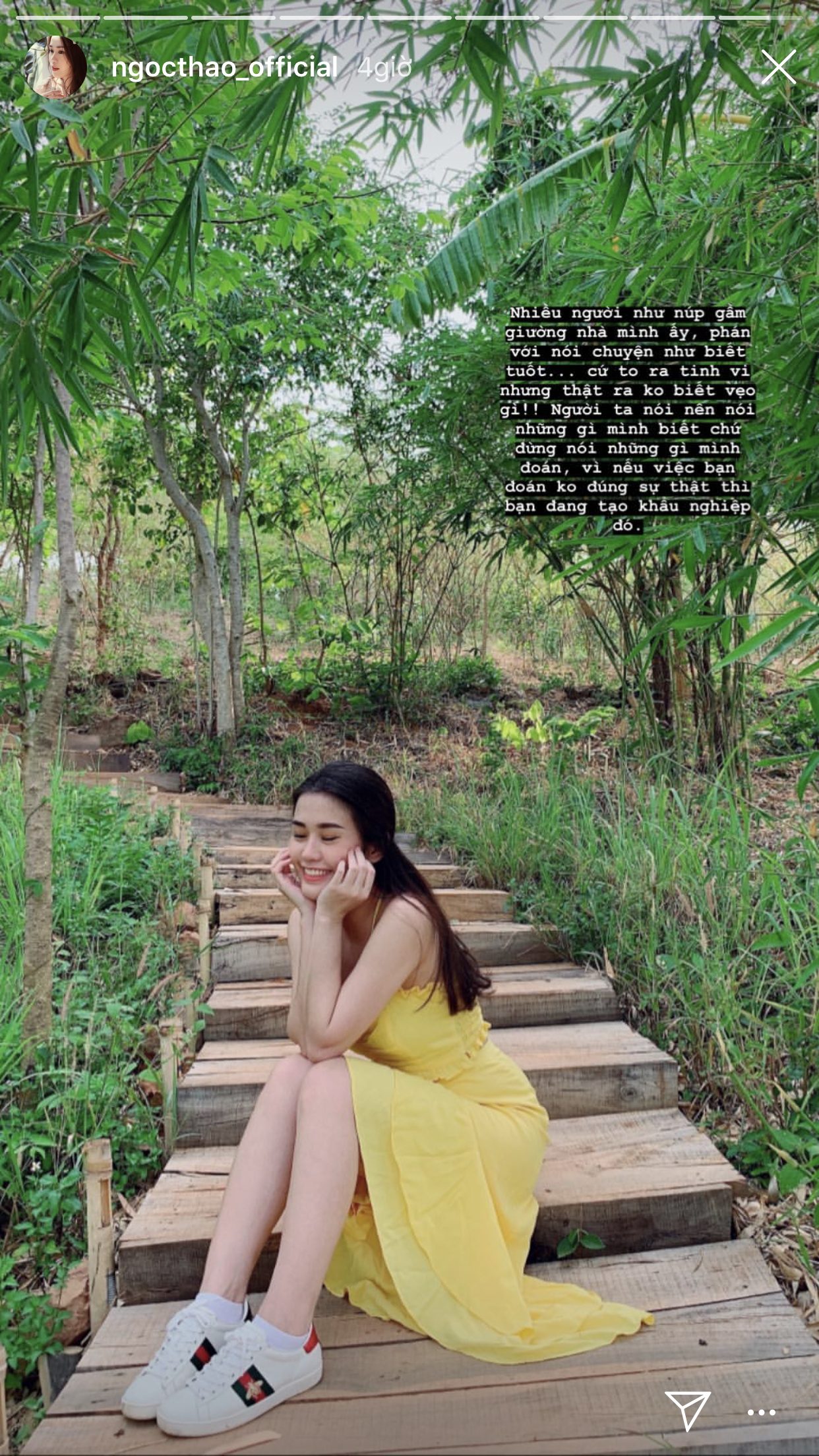 Cho đến khoảng giữa đêm qua, Ngọc Thảo đã có lời chia sẻ được cho là “phản pháo” lại những khán giả đã thêu dệt lên câu chuyện này và ẩn ý về việc cả hai vẫn còn đang trong một mối quan hệ tốt đẹp. Cô nàng nói rằng: “Nhiều người như núp gầm giường nhà mình ấy, phán và nói chuyện như biết tuốt… Cứ tỏ ra tinh vi nhưng thật ra không biết vẹo gì! Người ta nói nên nói những gì mình biết chứ đừng nói những gì mình đoán, vì nếu việc bạn đoán không đúng sự thật thì bạn đang tạo khẩu nghiệp đó!”.