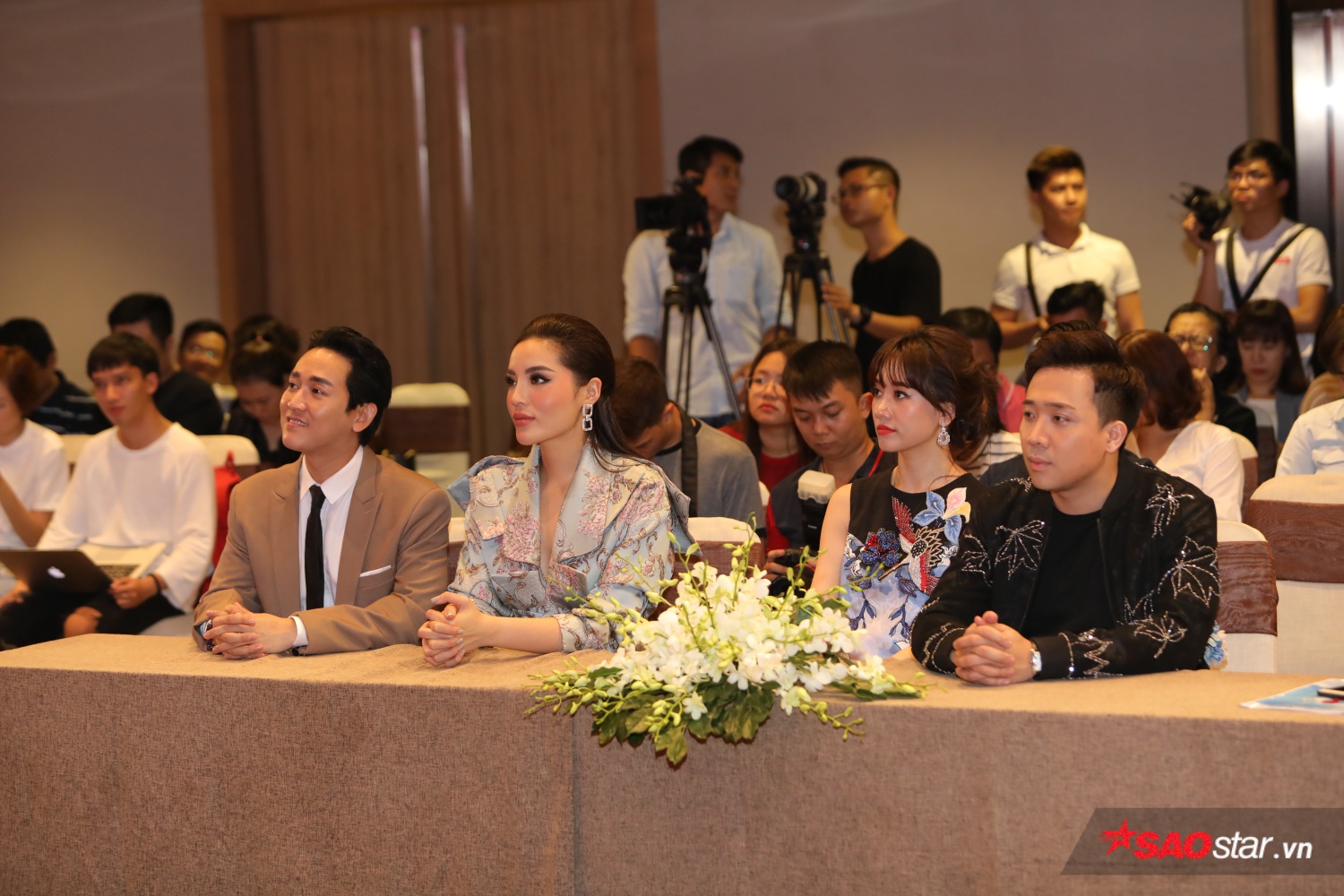 Hai nghệ sĩ Trường Giang, Hương Giang vì bận rộn với lịch trình trước đó nên chỉ có hai gia đình Việt - Hàn, Kỳ - Vĩ góp mặt trong buồi họp báo.