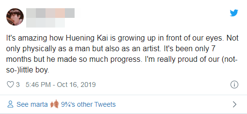 Sinh năm 2002 và là em út của nhóm nhạc trẻ, cư dân mạng luôn nhắc đến anh chàng như 1 người em trai bé bỏng và đáng yêu… Nhưng có vẻ mọi thứ đã nhanh chóng thay đổi với sự trở lại gần đây của TXT, và Hueningkai lại lần nữa khiến mọi người ‘đứng tim’ bởi vẻ ngoài của mình. Các fan hâm mộ đã nhanh chóng nhận ra sự thay đổi của Hueningkai trong Run Away, mái tóc ngắn nay đã được được nuôi dài hơn và sự thay đổi chiều cao của anh chàng khiến các fan không khỏi “tan chảy”.