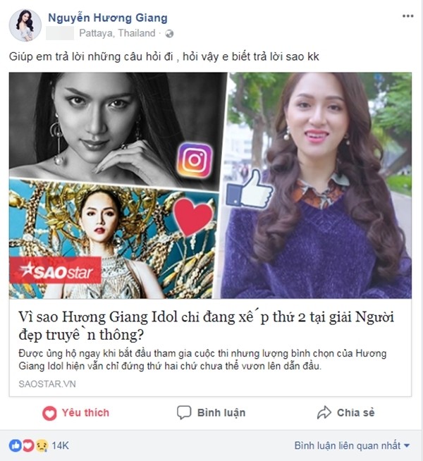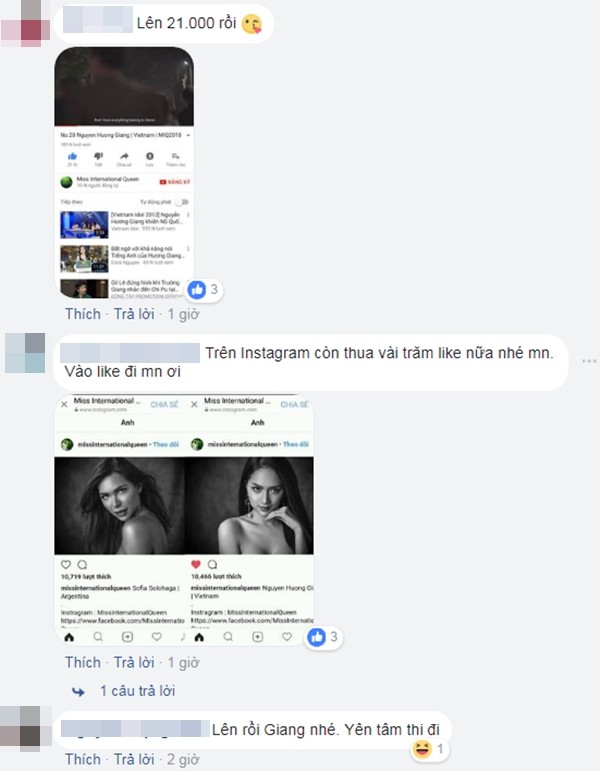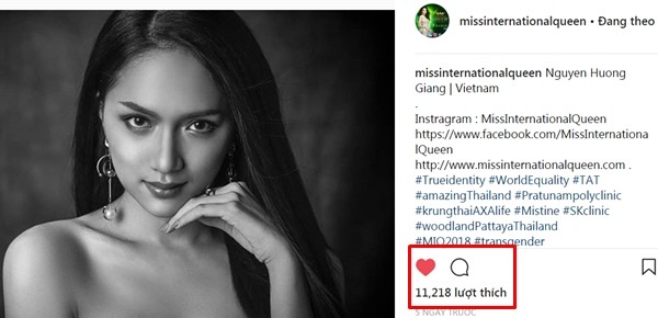 Tương tự ở “mặt trận” Instagram, các fan Việt Nam đã kéo nhau vào tài khoản của Miss International Queen để “thả tim” cho Hương Giang. Hiện tại, tuy khoảng cách không quá xa nhưng lượng like bức ảnh Glamshot của giọng ca Mùa ta đã yêu đã vượt mặt mỹ nhân Argentina.