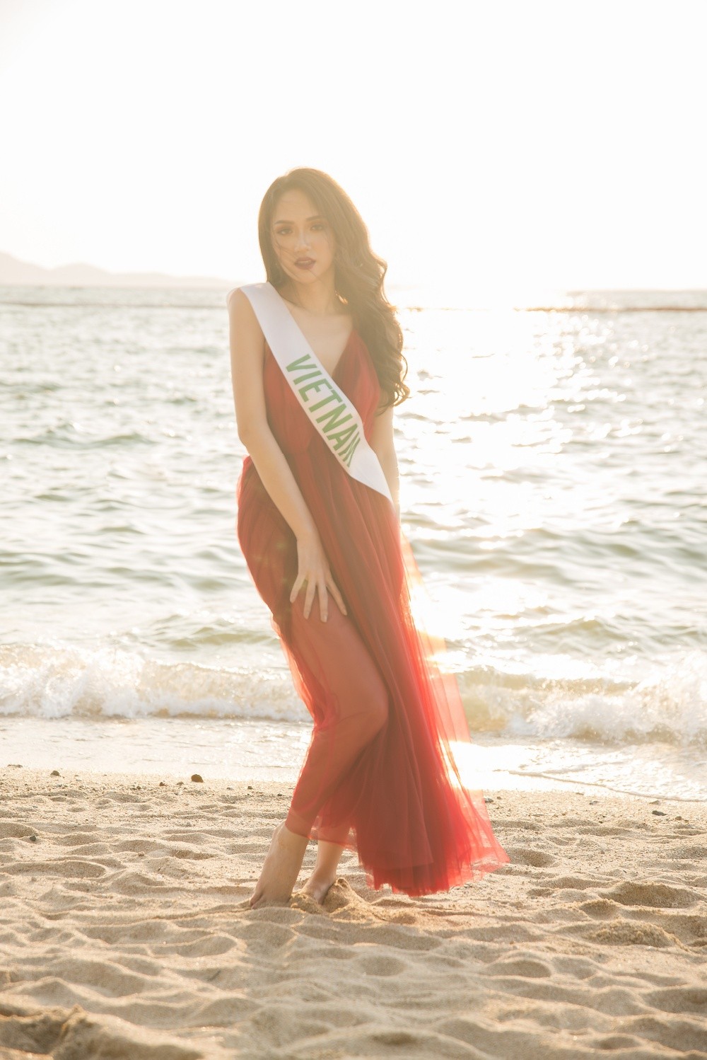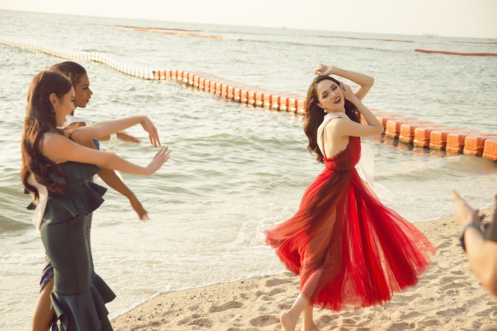 Tiếp nối các hoạt động của Hoa hậu Chuyển giới Quốc tế 2018, Hương Giang Idol vừa có buổi ghi hình trên bãi biển Pattaya cùng các thí sinh. Trong thiết kế đỏ rực rỡ, người đẹp sinh năm 1991 trở thành tâm điểm của sự chú ý với vẻ đẹp tựa nữ thần của mình.