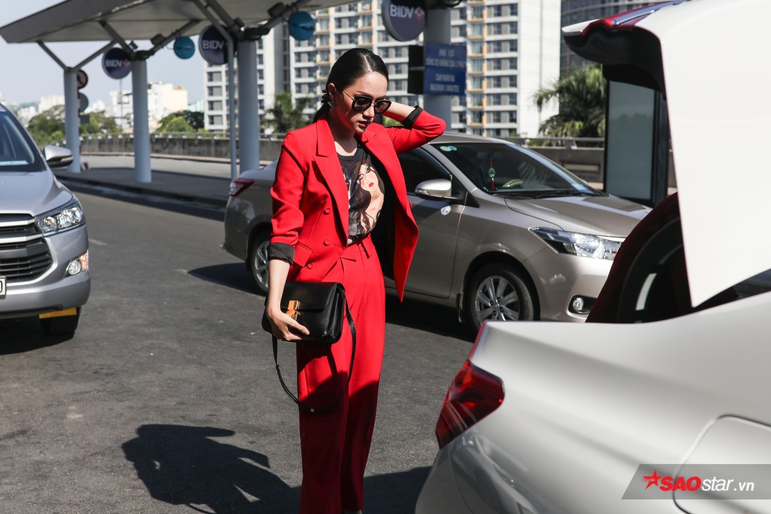 Giọng ca Em không hối tiếc xuất hiện nổi bật khi diện nguyên cây đỏ rực rỡ. Cô mang theo hơn 100 kg hành lý. Trong đó, riêng bộ trang phục dân tộc là 55 kg để chuẩn bị tốt nhất cho cuộc thi sắp tới. Bên cạnh đấy, ê-kíp theo hỗ trợ người đẹp gần 10 người, bao gồm nhiếp ảnh, trang điểm các hoạt động phụ, người lo trang phục…