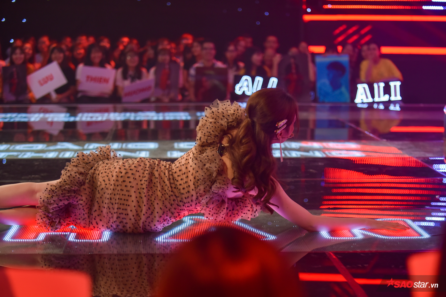 Cô nàng “nhảy hẳn” sang ghế của HLV Lưu Thiên Hương - Ali Hoàng Dương để thuyết phục thí sinh.