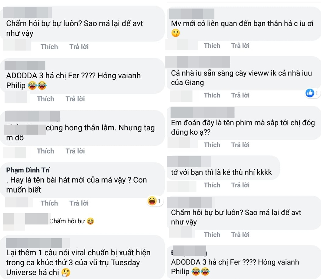 Bên cạnh sự quả quyết về MV ADODDA phần 3, các fan còn hỏi Hương Giang: “Em đoán đây là tên phim mà sắp tới chị đóng đúng không ạ?”.