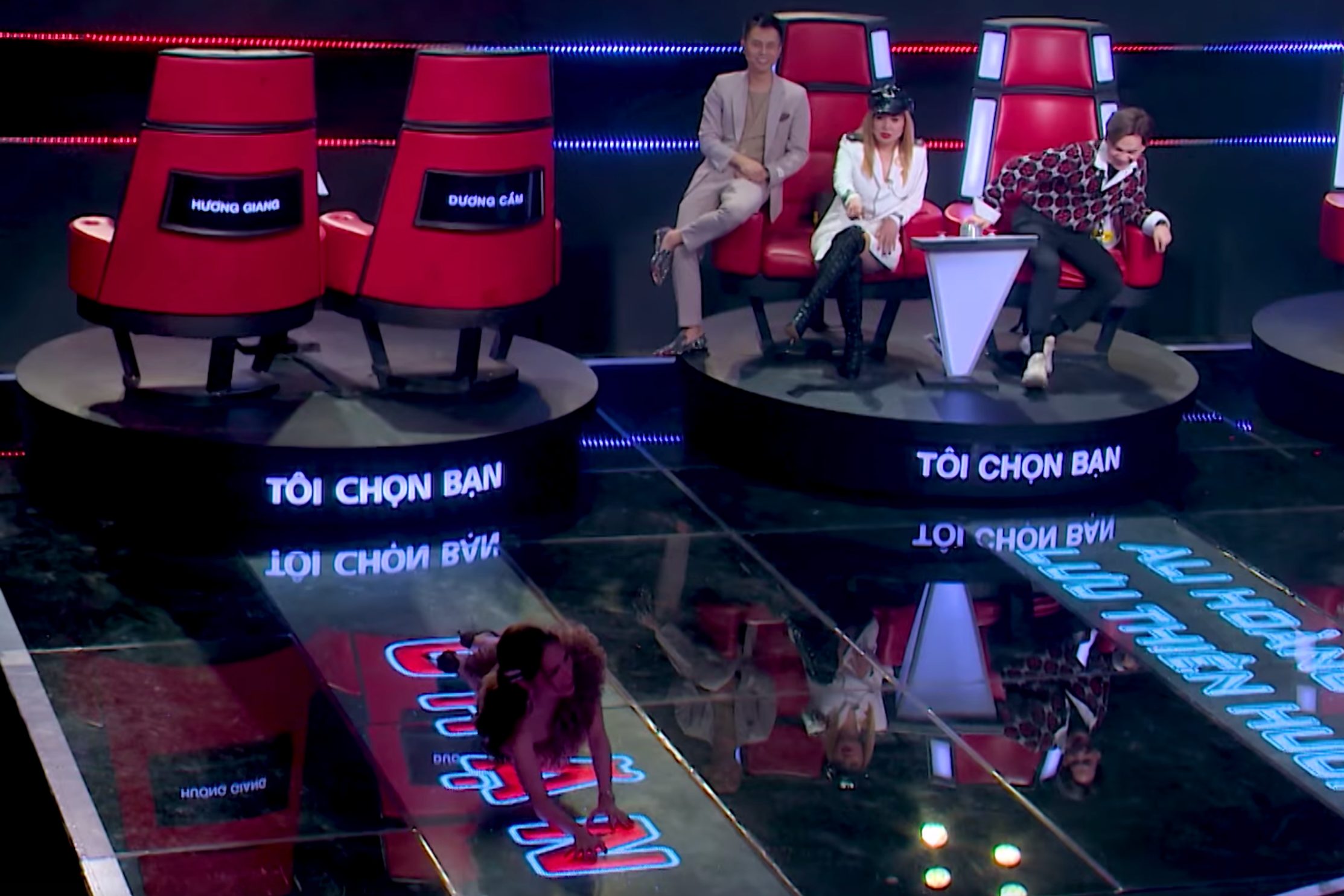Diễn biến được các fan chú ý nhất trong đoạn teaser giới thiệu tập 4 Giọng hát Việt nhí chính là khoảnh khắc đội Hương Giang - Dương Cầm bị chặn. Hoa hậu Chuyển giới Quốc tế 2018 - Hương Giang khổ sở nằm hẳn ra giữa sân khấu để che đi bảng đèn chặn.