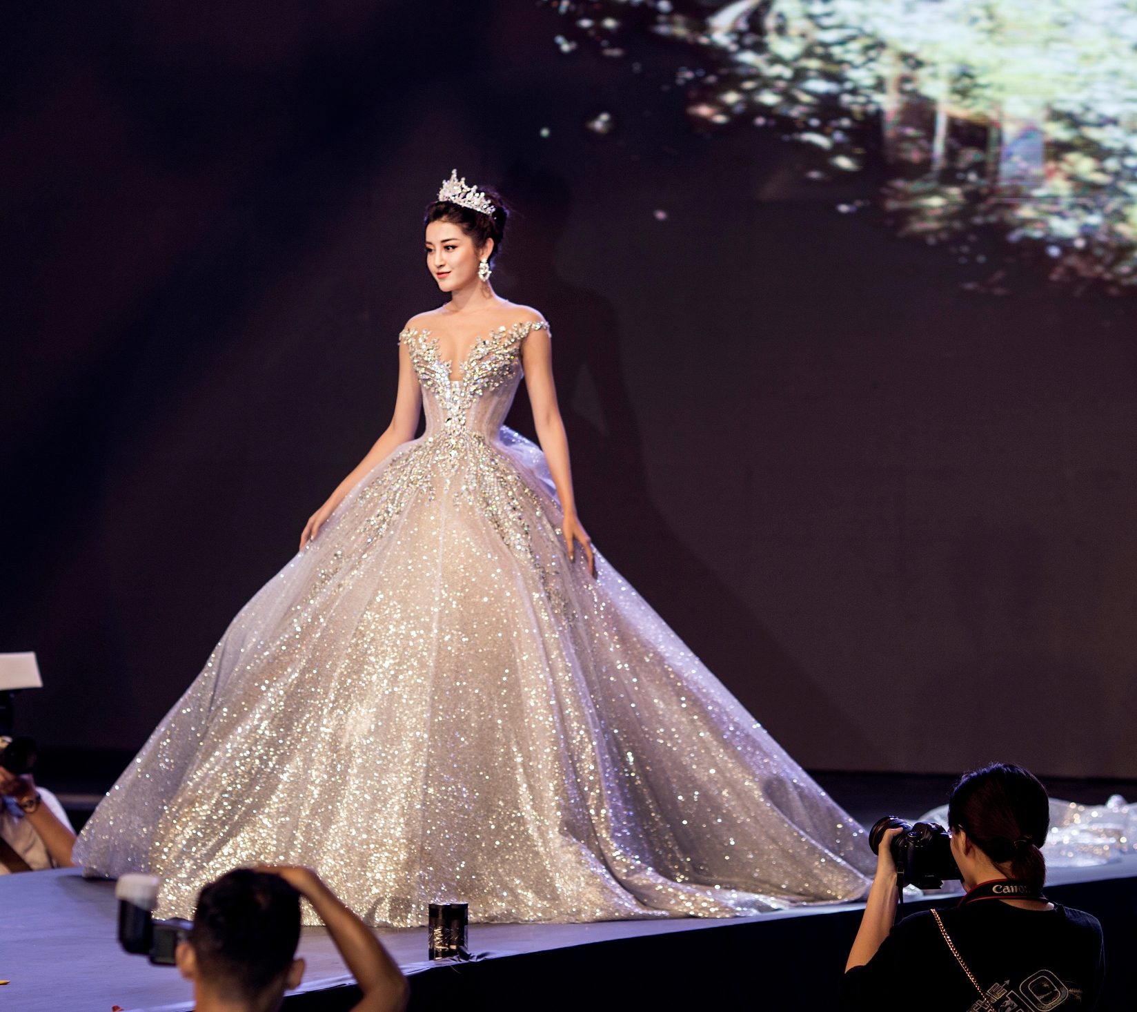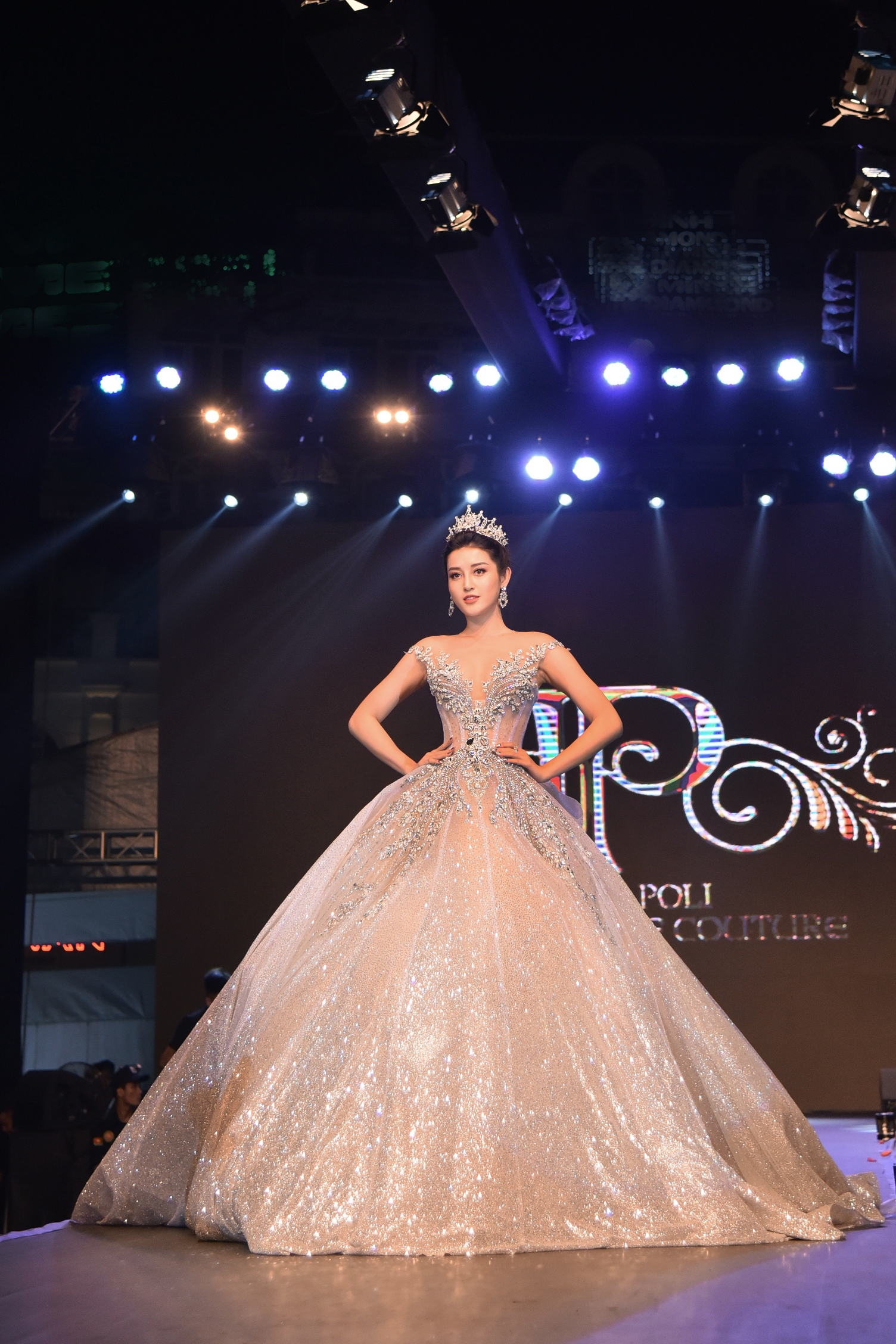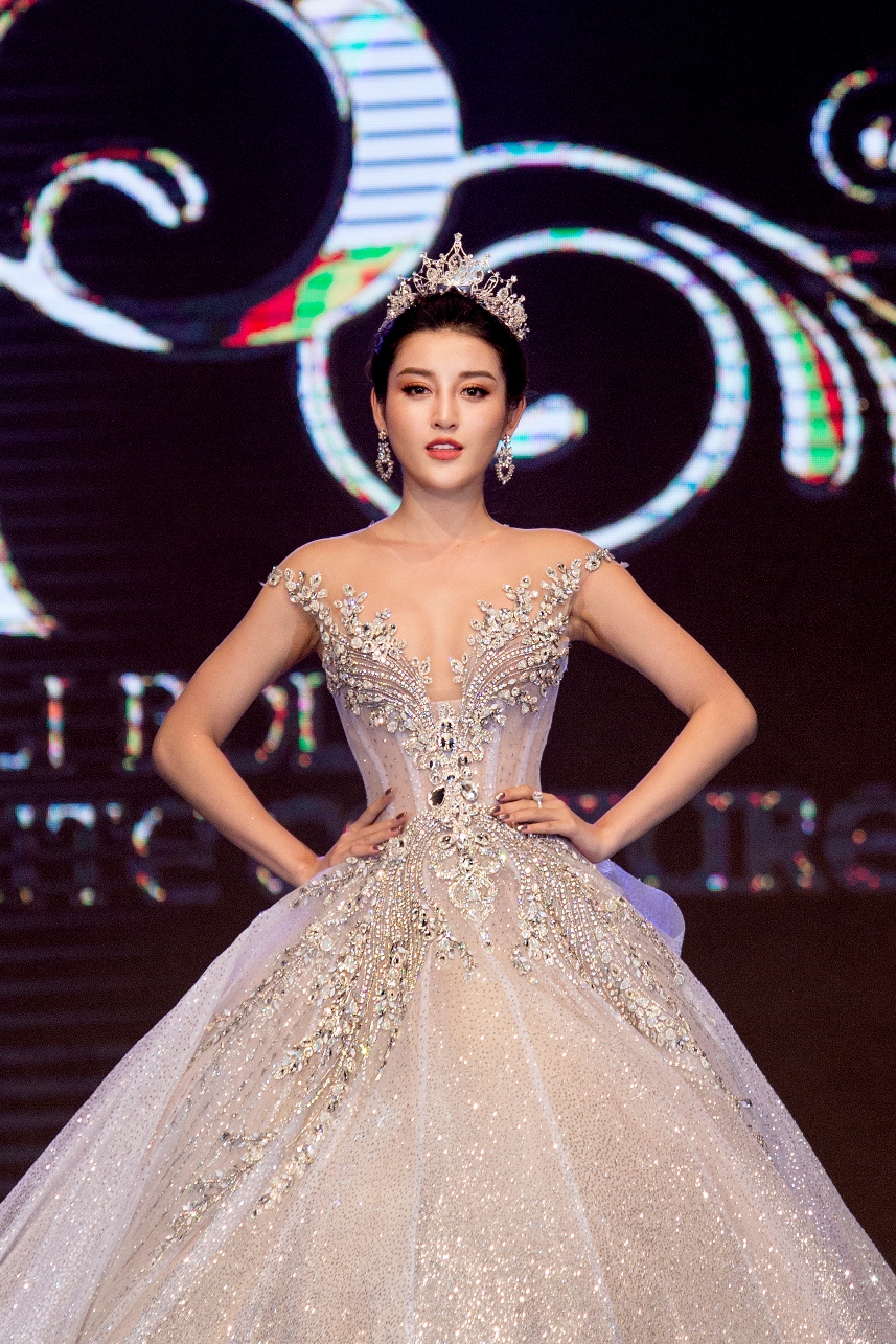 Chiếc váy khá to, nặng đến 25 kg nhưng Huyền My di chuyển khá dễ dàng.