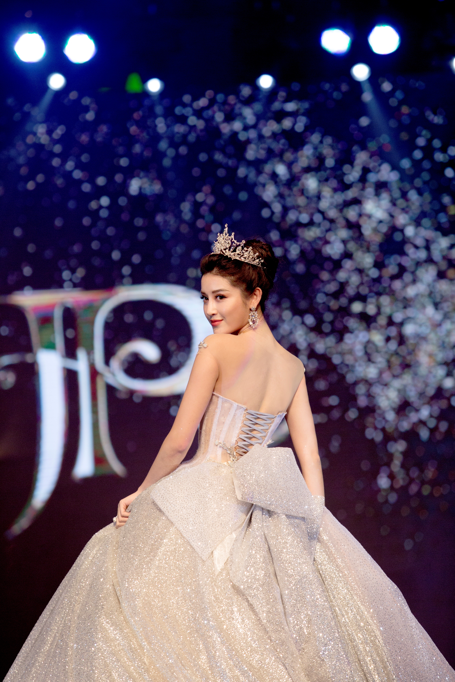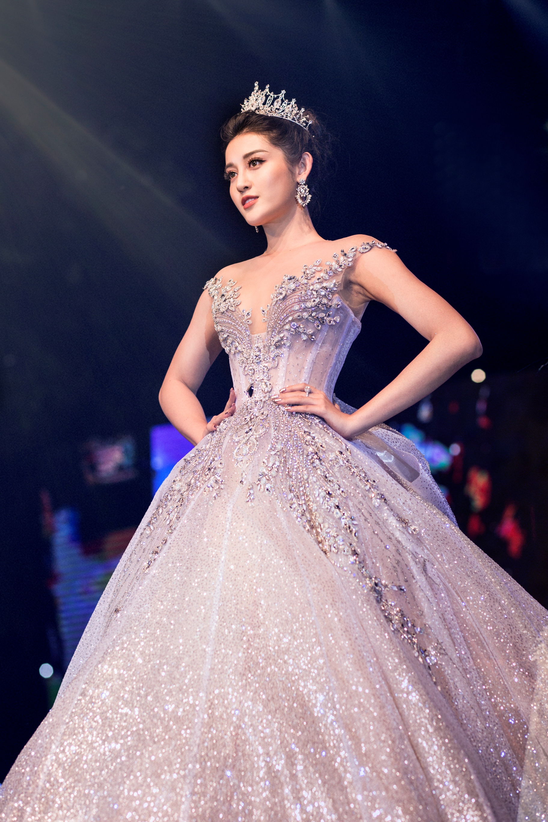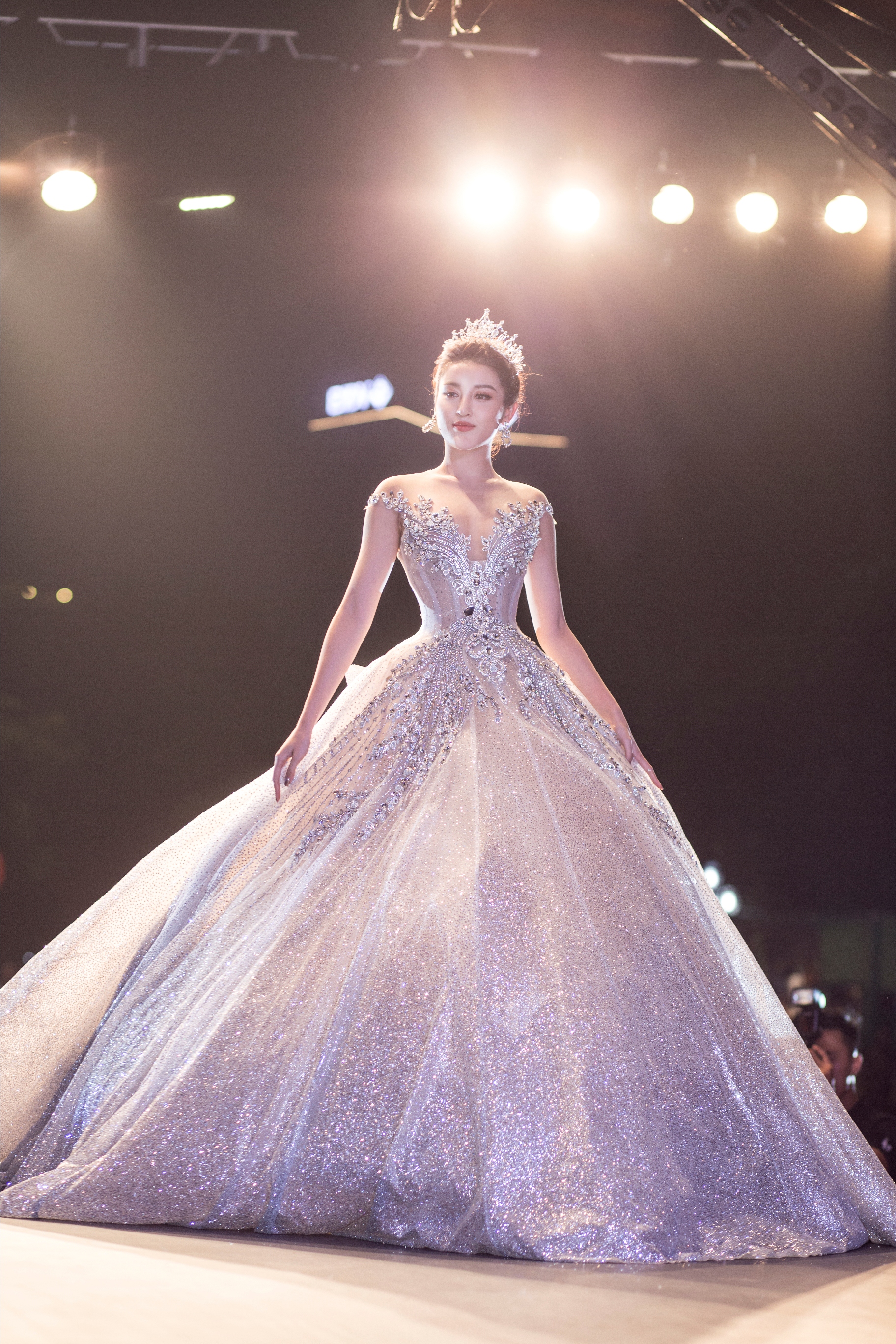 Chiếc váy khá to, nặng đến 25 kg nhưng Huyền My di chuyển khá dễ dàng.