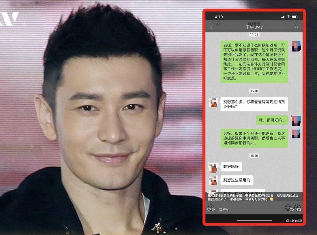 Vừa qua Sina giải trí đưa tin và ngày 22/2, một nhân viên của Huỳnh Hiểu Minh có nguyên quán ở Hồ Bắc đã chia sẻ ảnh chụp tin nhắn của ông chủ.