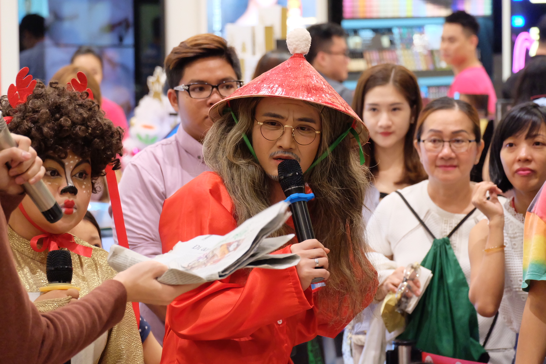 Xuất hiện giữa trung tâm mua sắm, Huỳnh Lập bất ngờ hoá thành ông già với râu tLia.ạc phơ, diện áo bà ba và nón lá.
