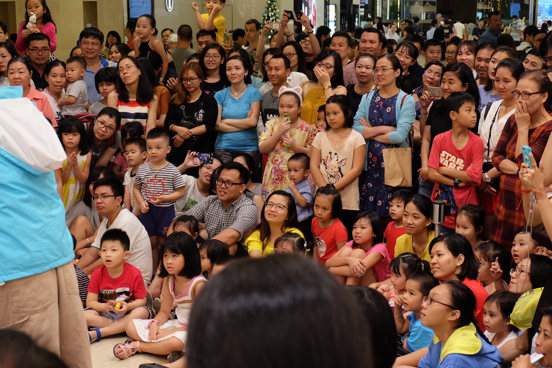 Hàng trăm em nhỏ được bố mẹ đưa đi chơi lần đầu nhìn thấy thần tượng của mình. Các bé ổn định chỗ ngồi và xem Huỳnh Lập biểu diễn.