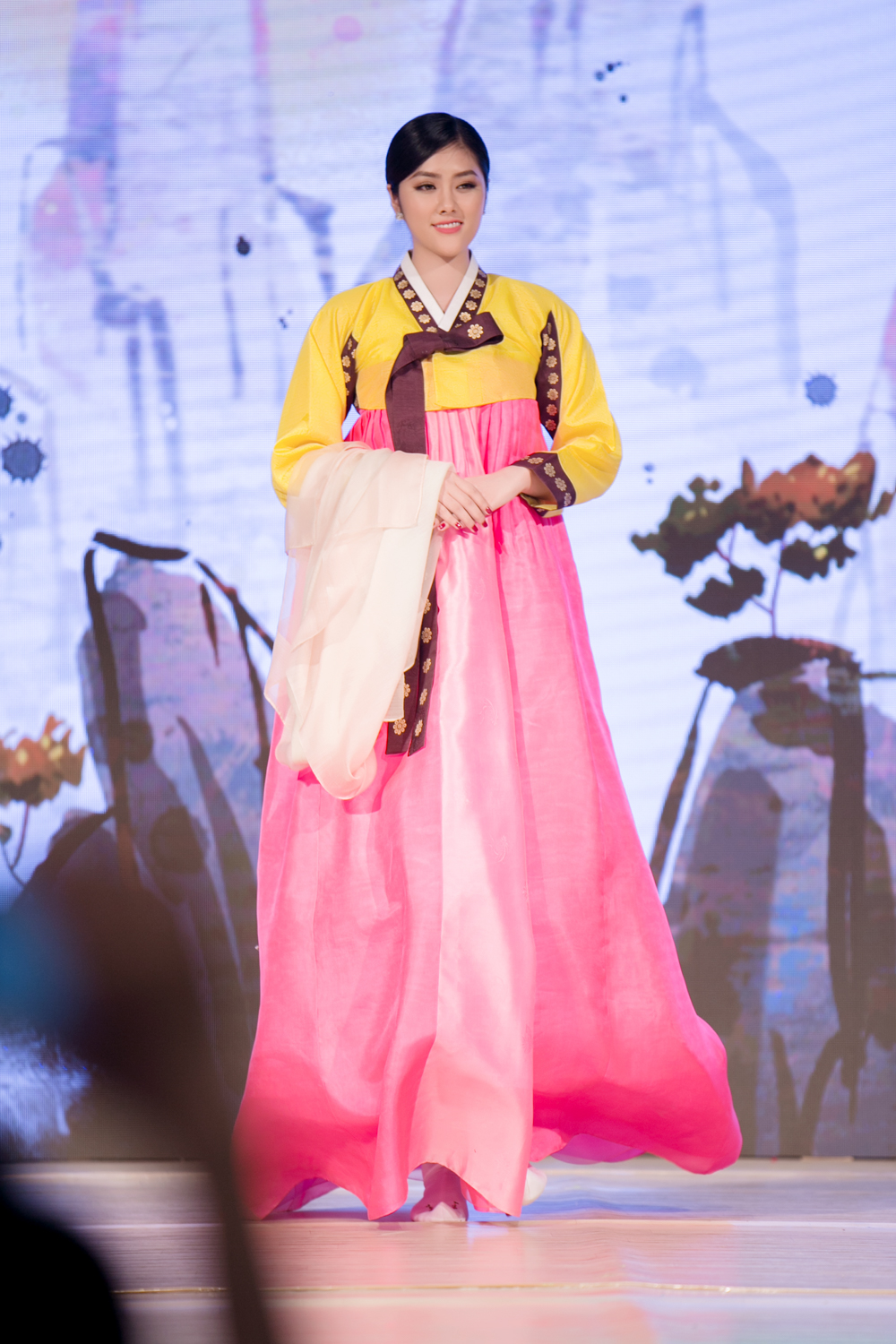 Bất ngờ hơn, Huỳnh Tiên còn được yêu cầu phải trao đổi trang phục truyền thông của 2 nước với nhau. Hoa hậu châu Á tại Úc đã có dịp mặc thử bộ trang phục Hanbok của Hàn Quốc.