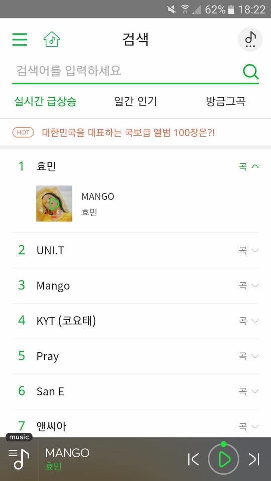 Từ khoá Hyomin vừa leo lên #1 Melon và ca khúc mới Mango cũng đã leo lên vị trí #3 sau khi chương trình phát sóng.