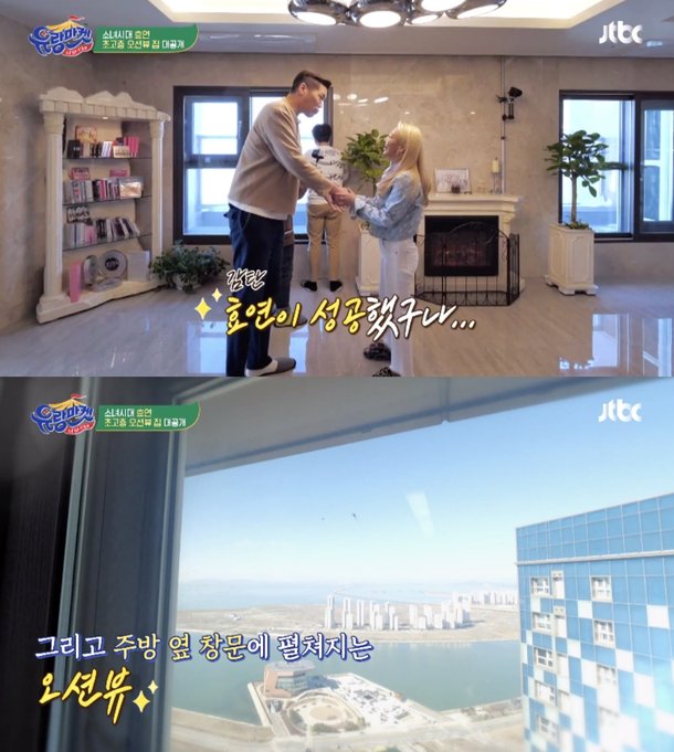 Căn hộ của Hyoyeon là căn hộ áp mái sang trọng, đồ nội thất trang nhã, không gian rộng và view nhìn ra đại dương. Nó làm cho bạn có cảm thấy như thể bạn đang ghé thăm một khách sạn 5 sao. Căn hộ chung cư nội thất đẹp và tầm nhìn toàn cảnh đã gây sốc cho cả người dẫn chương trình.