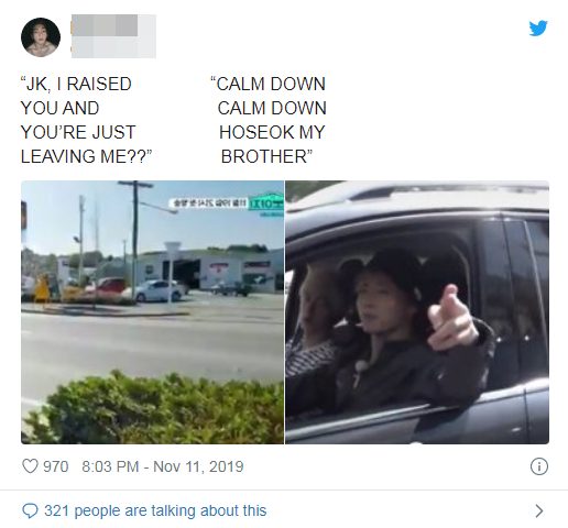 Dù đã từng chứng kiến những pha quên đồ đầy bá đạo của các thành viên trong nhóm thì J - Hope cũng không bao giờ tưởng tượng được rằng một ngày mình sẽ trở thành điều mà chính những người anh em đã cùng chung sống với nhau suốt 6 năm bỏ quên. Anh chàng không giấu nổi sự hoang mang khi liên tục hỏi nhân viên quay phim: “Họ đã đi thật sao ạ?”. Cuối cùng sau khi chấp nhận sự thật, J- Hope cũng giở điện thoại và gọi điện cho các thành viên chung xe. Các fan hâm mộ không thể nhịn cười nổi trước vẻ mặt bất lực của J-Hope khi nghe điện: “Này! Tại sao có thể bỏ anh lại được chứ!?”