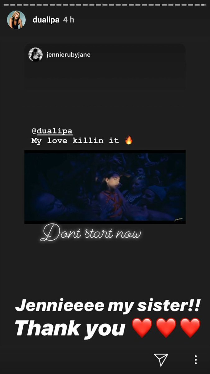 Các cô gái đã thể hiện tình bạn tuyệt vời của mình khi Jennie đăng bài khen ngợi Due Lipa trên Instastories của mình với caption “My love killing it”. Đáp lại tình cảm của Jennie, Dua Lipa chia sẻ lại bài đăng cũng như gọi cô nan gf là “my sister” (chị em của tôi).