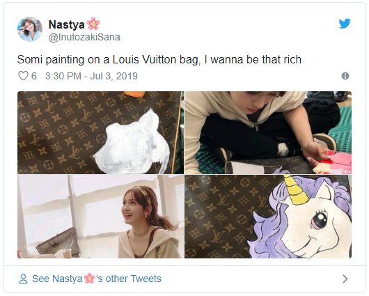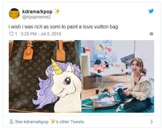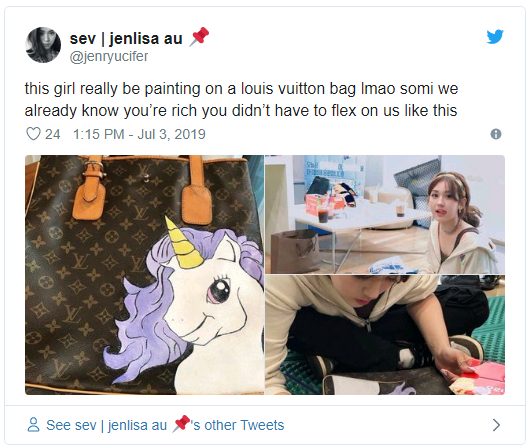 Trong khi đó, cư dân mạng tỏ ra rất ghen tị với Somi khi cô có đủ can đảm để vẽ lên chiếc túi Louis Vuitton đắt đỏ của mình.