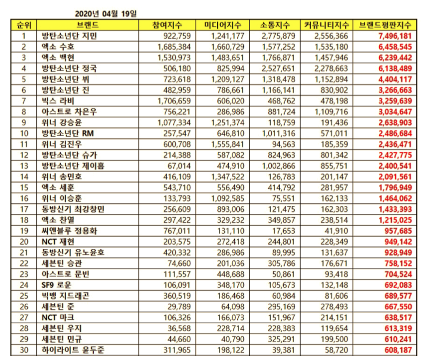 Từ ngày 18 tháng 3 đến ngày 16 tháng 4 năm 2020, Viện đã phân tích dữ liệu lớn của 630 thành viên nhóm nhạc nam và xác định rằng Jimin của BTS một lần nữa đứng đầu bảng xếp hạng với tổng số 7.496.181 điểm.