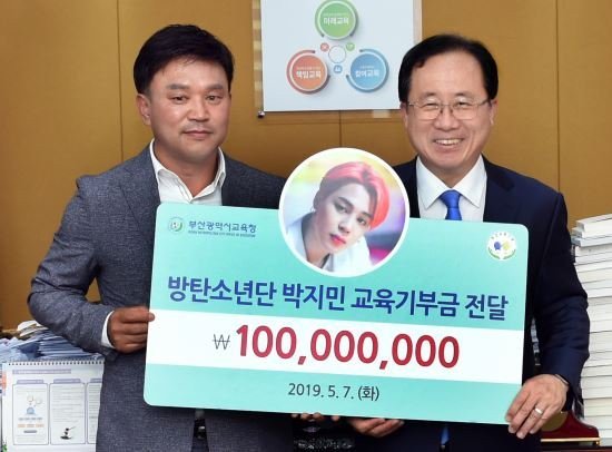 Mới đây ngày 7/5, Văn phòng Giáo dục Busan đã tiết lộ Jimin của BTS đã quyên góp 100 triệu won (hơn 2 tỷ đồng) để hỗ trợ cho các học sinh của quê nhà Busan. Được biết, cha của Jimin - ông Park Hyun Soo đã đích thân trao tặng số tiền thay cho nam ca sĩ tại Văn phòng Giáo dục.